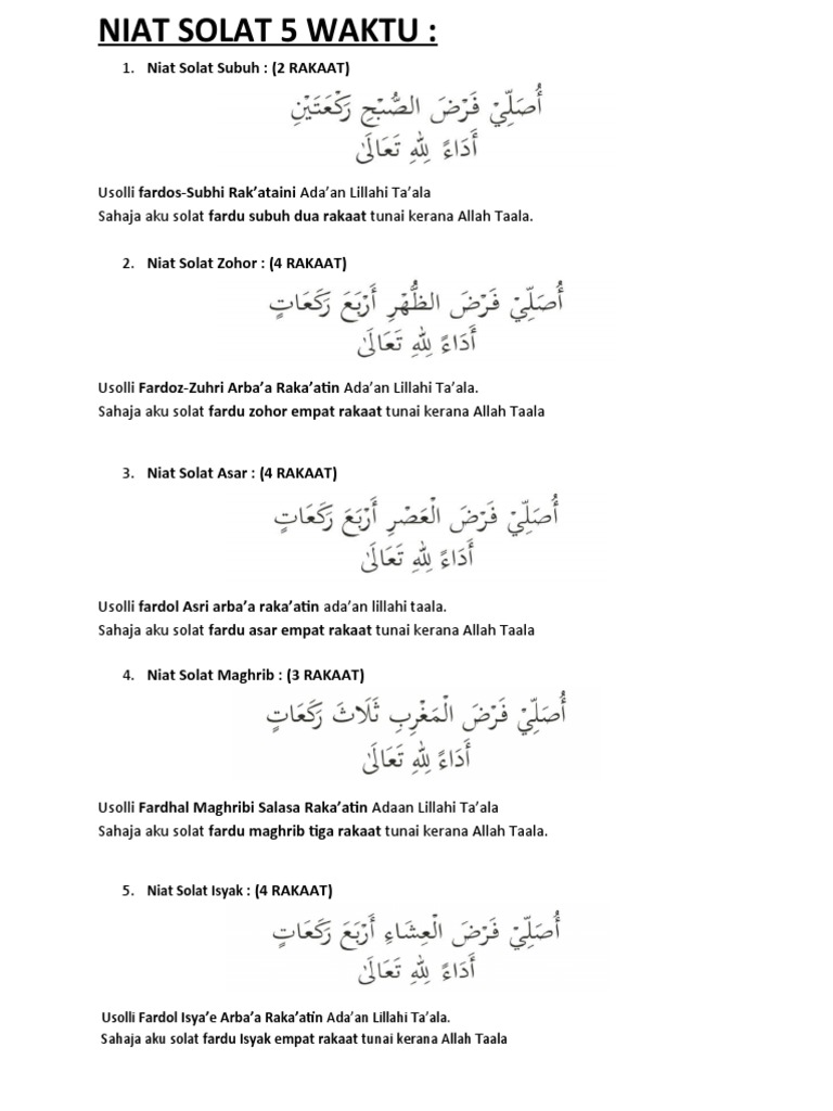 Dikutip tribunpontianakcoid dari dari zakatorid berikut ini niat sholat tarawih dan witir lengkap beserta artinya. Sahaja aku solat sunat sebelum Zohor dua rakaat kerana Allah Taala. بسم ٱلله ٱلرحمـن ٱلرحيم اللهم صل وسلم على سيدنا محمد Solat Sunat Taubat dilakukan selepas seseorang itu melakukan dosa dan kesalahan atau perlanggaran hukum-hukum agama atau berasa dirinya bersalah dan berdosa kepada Allah SWT.